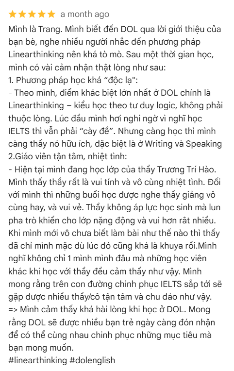 Không chỉ có phương pháp học khác biệt, DOL còn mang lại một môi trường học tập giàu năng lượng, nơi Thùy Trang luôn được khích lệ tiến bộ. Với sự kết hợp giữa Linearthinking, thầy cô tận tâm và bạn học nhiệt huyết, Trang đã chia sẻ những sự hài lòng của mình khi theo học tại trung tâm. Bạn cũng hy vọng ngày càng nhiều bạn trẻ biết đến DOL để cùng nhau chinh phục mục tiêu học tập và phát triển bản thân.