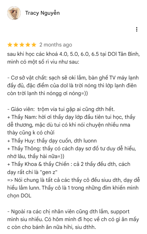 Sau 4 khóa học tại DOL Tân Bình, Huyền Châu nhận ra rằng hành trình học IELTS không chỉ là câu chuyện về điểm số, mà còn là khoảng thời gian trưởng thành và thay đổi tư duy. “Thật sự Dol là nơi lý tưởng để bạn bắt đầu thử sức mình với IELTS với phương pháp Linearthinking hiệu quả cùng dàng giáo viên siêu chất lượng luôn ”- Châu chia sẻ.