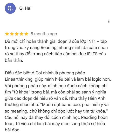 Chỉ sau giai đoạn 3 của lớp Intensive 1 (INT 1), Quốc Hải đã cảm nhận rõ sự thay đổi trong cách đọc hiểu và tư duy khi làm bài IELTS Reading- nhờ phương pháp Linearthinking và sự tận tâm của thầy Hiền Anh tại DOL English.
