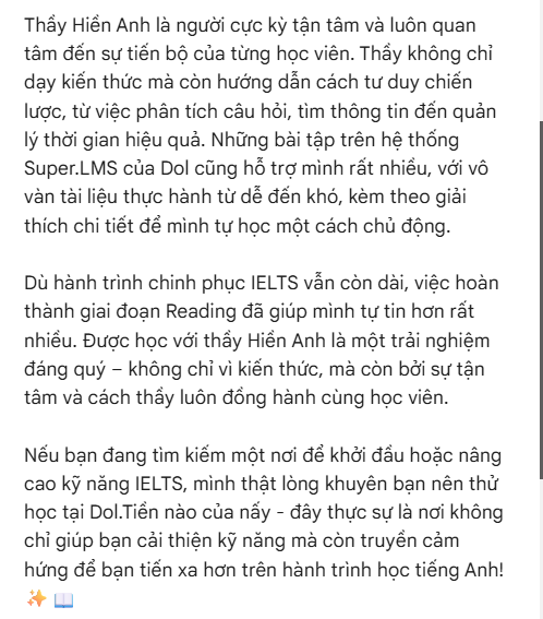 Bạn chia sẻ thêm: “Được học với thầy Hiền Anh là một trải nghiệm đáng quý, không chỉ vì kiến thức, mà còn bởi sự tận tâm và cách thầy luôn đồng hành cùng học viên.”