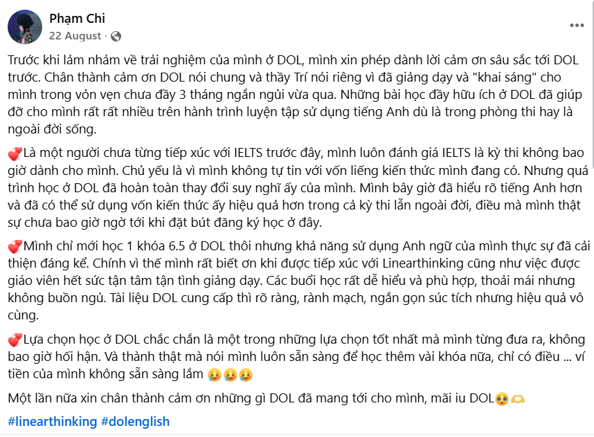Từ một người từng nghĩ IELTS là điều “ngoài tầm với”, Thảo Chi đã thay đổi hoàn toàn góc nhìn sau khóa học tại DOL English, nhờ phương pháp Linearthinking và sự đồng hành tận tâm từ thầy Minh Trí.