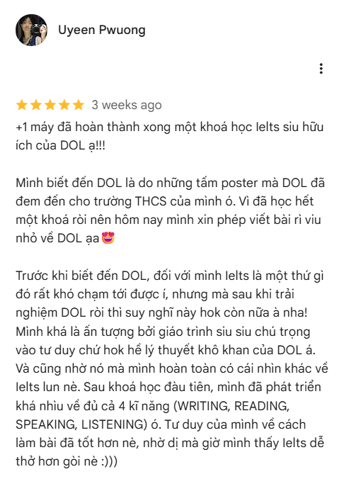 Cảm ơn bài “rì viu nhỏ” nhưng vô cùng chân thành của Uyên Phương. Những chia sẻ quý giá của bạn chính là động lực để DOL English tiếp tục cố gắng mỗi ngày, mang đến nhiều trải nghiệm học tập tốt hơn nữa cho từng bạn học viên.