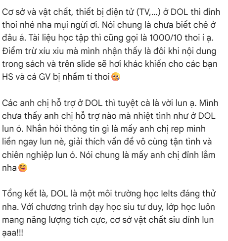 Kết thúc bài review của mình, Uyên Phương cho biết: “DOL là một môi trường học IELTS đáng thử nha. Với chương trình dạy học siu tư duy, lớp học luôn mang năng lượng tích cực, cơ sở vật chất siu đỉnh lun ạaa!!!”