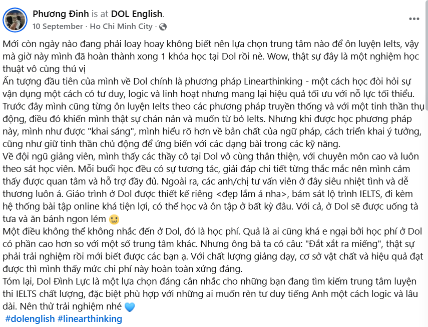 Giống như DOLBIE Mỹ Phương, bạn có thể tìm thấy cách học thông minh và nguồn cảm hứng mới để chinh phục IELTS. Với Linearthinking, giáo viên tận tâm và môi trường học đầy năng lượng, DOL English luôn là lựa chọn xứng đáng để bạn đầu tư cho hành trình phát triển tư duy và ngôn ngữ.