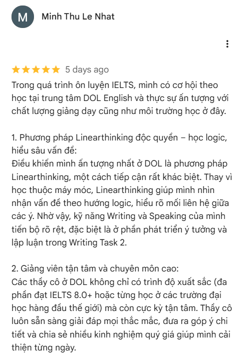 Khi nhìn lại hành trình của mình, DOLBIE Minh Thư khẳng định rằng DOL English là lựa chọn xứng đáng cho bất kỳ ai nghiêm túc với IELTS: “Từ phương pháp học rõ ràng, giáo viên chất lượng, cho đến môi trường học chuyên nghiệp - tất cả đều giúp mình đạt được kết quả tốt và có trải nghiệm học rất đáng nhớ.”