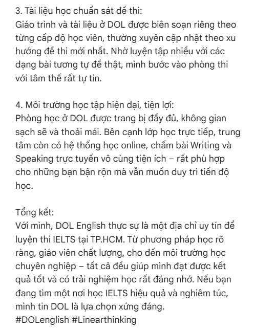 Ngoài lớp học trực tiếp, DOL còn có hệ thống học online và chấm bài Writing, Speaking trực tuyến, giúp bạn duy trì tiến độ học ngay cả khi bận rộn: “Bên cạnh lớp học trực tiếp, trung tâm còn có hệ thống học online, chấm bài Writing và Speaking trực tuyến vô cùng tiện ích - rất phù hợp cho những bạn bận rộn mà vẫn muốn duy trì tiến độ học.”