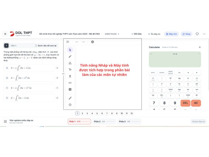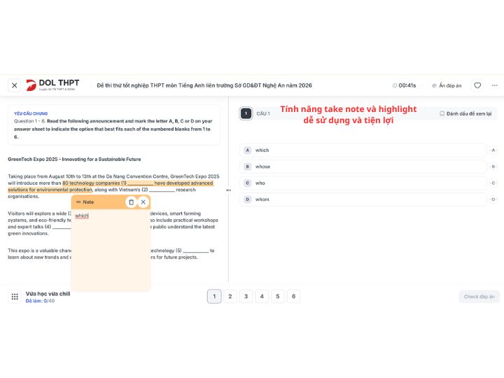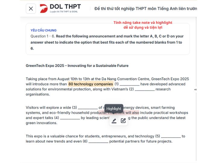 3. 🖥️ Trải nghiệm làm bài online thực chiến được đầu tư kỹ lưỡng: Một ưu điểm rất đáng chú ý của DOL THPT là trải nghiệm làm bài được thiết kế rất chỉn chu. Nền tảng cho phép học sinh luyện đề với giao diện trực quan, thao tác mượt mà và có các tính năng hỗ trợ như: highlight, take note, đánh dấu câu để xem lại, viết nháp, máy tính, check đáp án hoặc chuyển đổi chế độ làm bài. Điều này giúp việc luyện ĐGNL và ĐGTD trở nên gần với trải nghiệm thi thật hơn, đặc biệt hữu ích với những bạn muốn rèn phản xạ và quản lý thời gian tốt hơn.