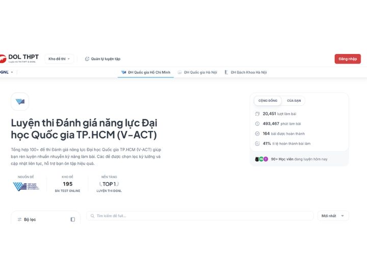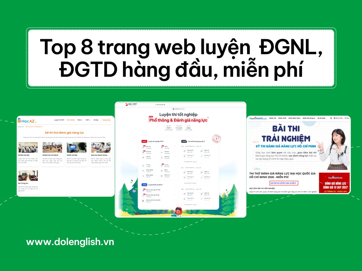 Trong bài viết này, DOL sẽ tổng hợp 8 trang web ôn thi ĐGNL & ĐGTD miễn phí đáng tham khảo hiện nay. Danh sách tập trung vào những nền tảng hỗ trợ trực tiếp cho nhu cầu luyện đề, thi thử, học theo từng dạng bài và tự học hiệu quả, trong đó DOL THPT sẽ là một lựa chọn nổi bật nếu bạn muốn tìm kiếm một website vừa có trải nghiệm làm bài online, vừa có định hướng luyện tập rõ ràng cho các kỳ thi ĐGNL và ĐGTD.