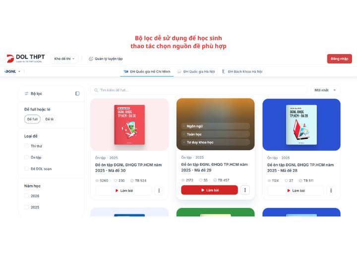 1. 📚 Hệ thống bài test được tổ chức rõ ràng theo từng kỳ thi: DOL THPT hiện cung cấp 408+ bài test online ở mục luyện thi ĐGNL & ĐGTD, giúp học sinh dễ dàng chọn đúng bài thi mình đang hướng đến thay vì phải tự lọc quá nhiều nguồn tài liệu rời rạc. Cách sắp xếp này phù hợp với những bạn muốn ôn tập có trọng tâm ngay từ đầu và cần một nền tảng gọn, rõ, dễ bắt nhịp độ học.