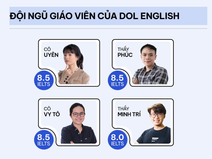 Đội ngũ giáo viên tại DOL English là những chuyên gia về ngôn ngữ giàu kinh nghiệm, sở hữu thành tích IELTS ấn tượng (từ 8.0+ IELTS) và trình độ chuyên môn cao. Nhiều thầy cô là Thạc sĩ, Thủ khoa, Á khoa, Giảng viên đến từ các trường Đại học danh tiếng, được chứng nhận bởi các chứng chỉ giảng dạy quốc tế như CELTA, TESOL.