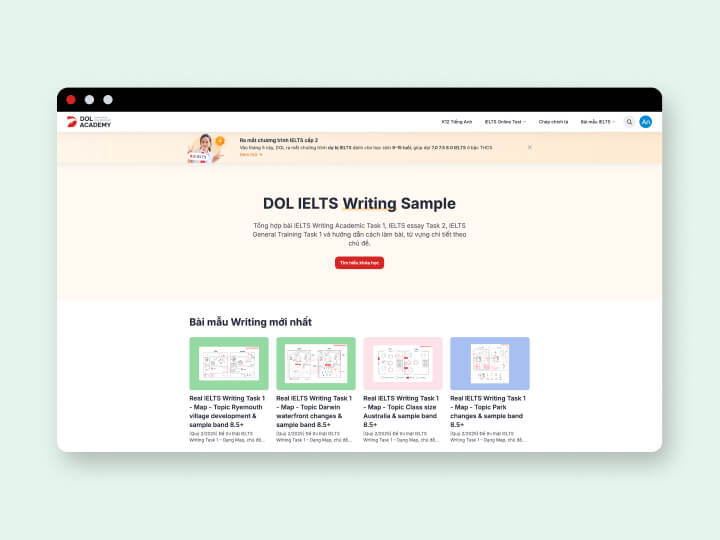 Kho bài mẫu chất lượng cao: DOL Academy cung cấp nhiều bài mẫu IELTS Writing (task 1 và task 2) band 8.0-8.5+ với outline logic, highlight từ vựng/collocations học thuật hay, có giải thích từ ngữ kèm phát âm chuẩn, hình ảnh minh họa, ví dụ cụ thể về cách sử dụng đúng ngữ cảnh và bài tập ứng dụng – rất hữu ích cho việc học từ/cụm từ học thuật và cấu trúc ý tưởng.