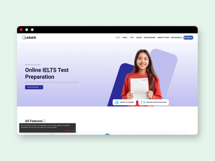 Edukik là nền tảng học và luyện thi tiếng Anh tích hợp AI, chuyên hỗ trợ các kỳ thi chuẩn hóa như IELTS, TOEFL, PTE… Trong đó, phần luyện IELTS Writing của Edukik sử dụng hệ thống chấm điểm tự động thông minh, đánh giá bài viết dựa trên 4 tiêu chí sát với chấm thi IELTS thực tế.